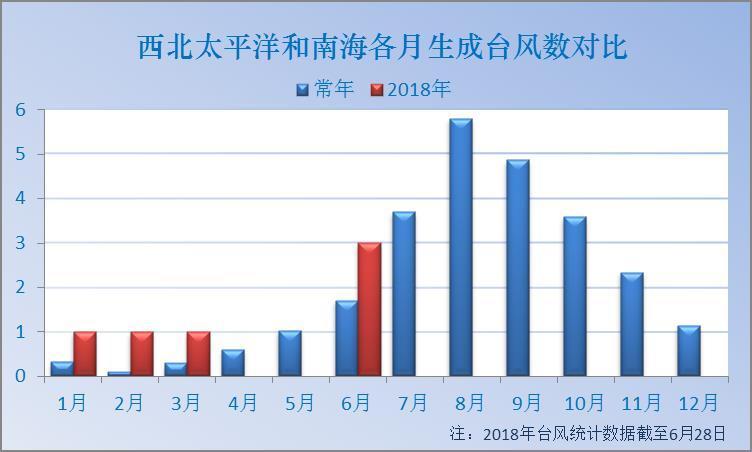 到目前為止,今年西北太平洋和南海已經(jīng)有6個臺風生成,1個臺風登陸我國,常年1-6月平均會生成4.1個臺風,登陸0.63個。實際上今年無論生成臺風個數(shù)還是登陸個數(shù)都比常年平均偏多。