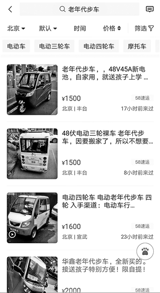 北青報記者在“閑魚”“轉轉”等二手貨交易平臺上鍵入“老年代步車”后,可以搜索上百條等待交易的信息,有大興、豐臺、順義、東城、朝陽等地車主發(fā)布的交易信息,“北京車主看車方便”,多為當面交易。
