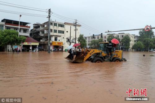 7月6日,江西省撫州市東鄉區遭遇特大暴雨襲擊,區城管局、水利局出動鏟車、皮滑艇等工具,幫助市民渡過積水路段。何江華 攝 圖片來源:視覺中國