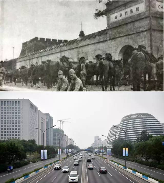 上圖為1937年8月8日,日本騎兵在朝陽門車站集結(資料照片);下圖為2017年7月3日拍攝的朝陽門地區(新華社記者 張晨霖 攝)。