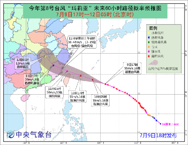 預(yù)計(jì),“瑪莉亞”將以每小時(shí)30公里左右的速度向西偏北方向移動(dòng),逐漸向臺(tái)灣以東洋面靠近,將于10日夜間登陸或擦過(guò)臺(tái)灣東北部,并于11日早晨到上午在福建晉江到浙江溫州之間沿海再次登陸(臺(tái)風(fēng)級(jí)到強(qiáng)臺(tái)風(fēng)級(jí),13-14級(jí),38-45m/s)。登陸后繼續(xù)向西北方向移動(dòng),強(qiáng)度逐漸減弱。此外,9日14時(shí)-10日14時(shí),臺(tái)灣東北洋面和東海南部的中東部海域的風(fēng)力將逐漸加大到7-10級(jí),部分海域風(fēng)力可達(dá)11-12級(jí);琉球群島以東洋面將有9-12級(jí)大風(fēng),臺(tái)風(fēng)“瑪莉亞”中心經(jīng)過(guò)的附近洋面的風(fēng)力有13-17級(jí)。