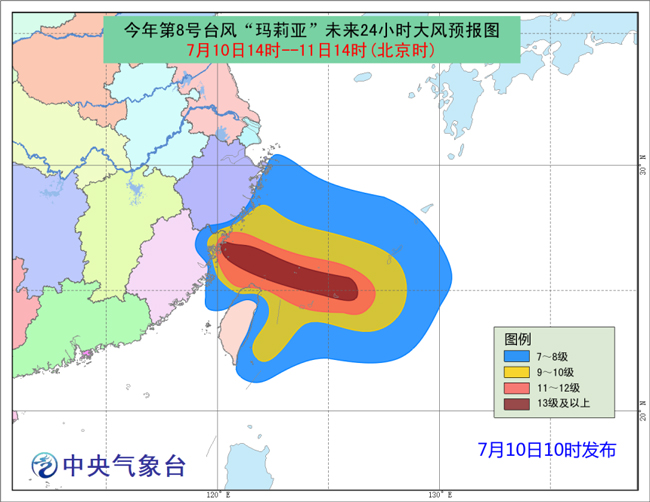 大風預報:10日14時至11日14時,臺灣以東洋面、東海南部、臺灣海峽北部、福建沿海、臺灣沿海、浙江沿海的風力將逐漸加大到7-10級,其中東海南部偏南海域、臺灣東北部洋面、臺灣北部沿海、福建東北部沿海、浙江東南部沿海的風力可達11-12級,“瑪莉亞”中心經過的附近海面或地區的風力有13-16級,陣風17級。