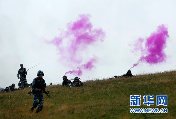 紅藍對抗中,殲“敵”信號發射后,“紅軍”主攻隊在模擬連連長指揮下,按照戰術編組發起進攻(資料照片)。新華社發(姚立 攝)