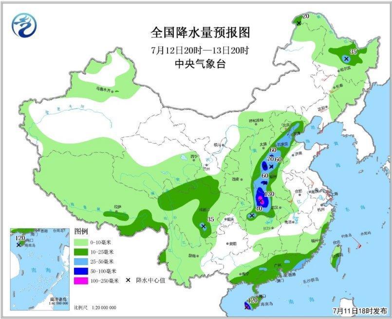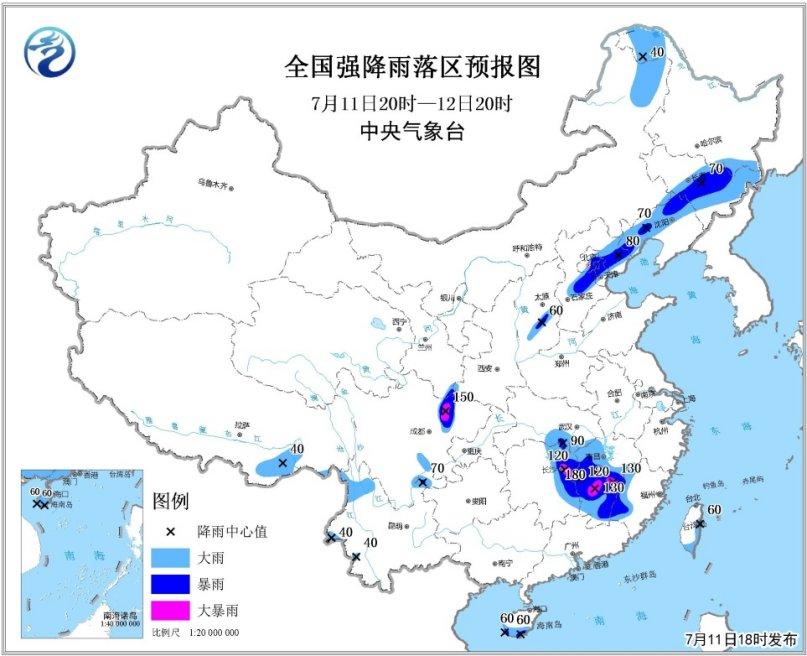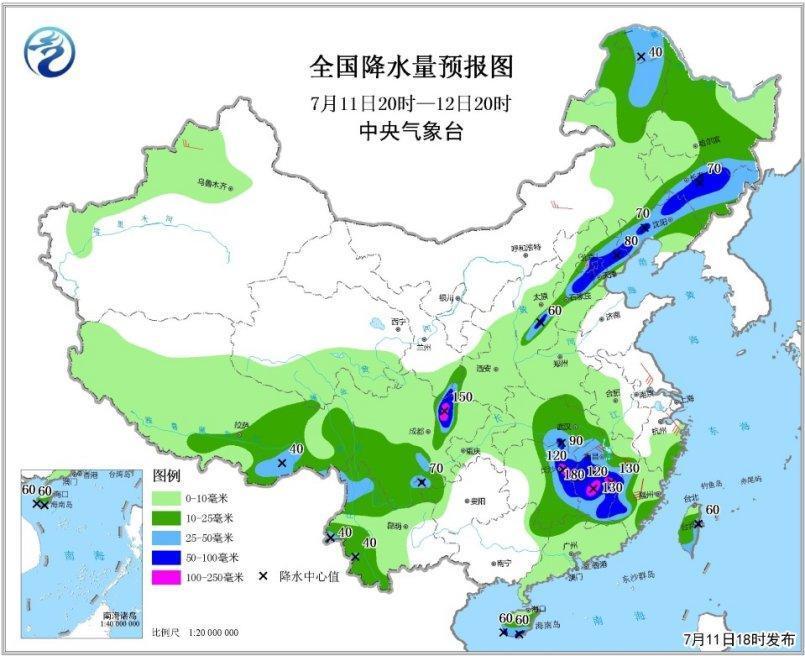 預計7月11日20時至12日20時,福建西部、江西、湖南東部、湖北東南部、四川盆地西北部和南部、山西中部、河北中部和東北部、北京東南部、天津中北部、遼寧西部和北部、吉林中東部以及海南島南部、云南西部等地有大雨或暴雨,其中,江西中部、湖南東北部、四川盆地西北部等地的局部地區有大暴雨(100~180毫米);上述地區最大小時降水量30~50毫米,局地60毫米以上(見圖1)。中央氣象臺7月11日18時繼續發布暴雨黃色預警。