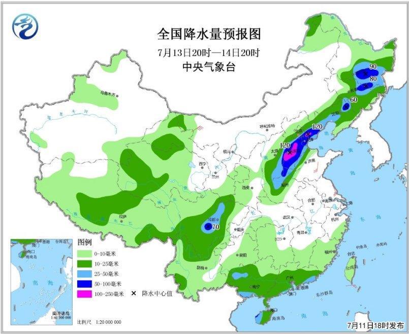 7月13日20時至14日20時,東北地區中南部、華北中東部、黃淮西北部、四川盆地西部等地有大到暴雨,局部有大暴雨(100~120毫米);上述局部地區將伴有短時強降水等強對流天氣(見圖4)。