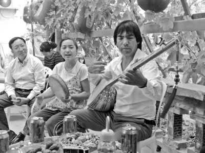 圖為近日,和田縣和諧新村村民吐地買買提父女二人,為上門家訪的北京援疆干部彈唱一曲。