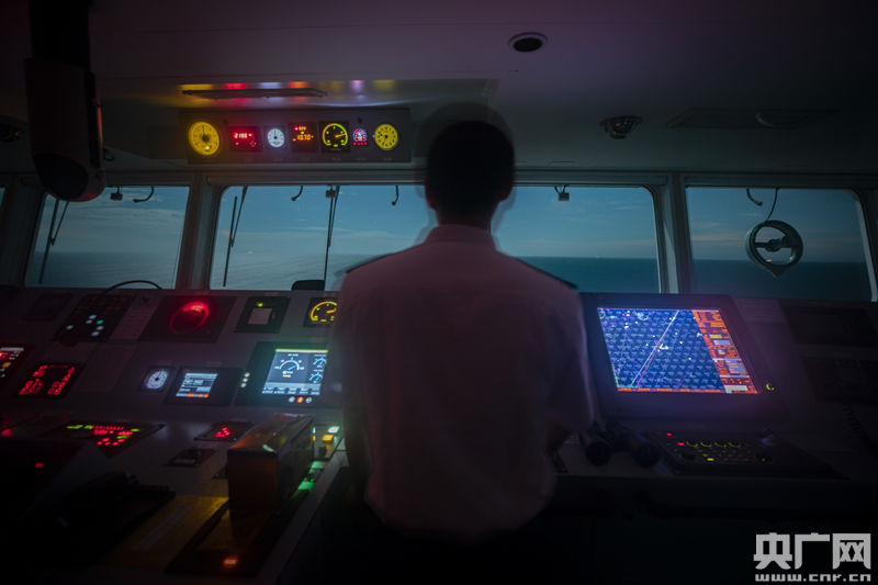 “也是為了防范電子設(shè)備出現(xiàn)意外嘛。”除了各類儀表的光,駕駛臺里幾乎是漆黑一片。趕在天黑前,三副身后的黑色幕簾被死死拉嚴,沒留一點縫隙。