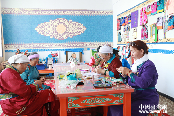 薩仁格日勒(右三)與朋友們縫制民族服飾。(中國(guó)臺(tái)灣網(wǎng) 李寧 攝)