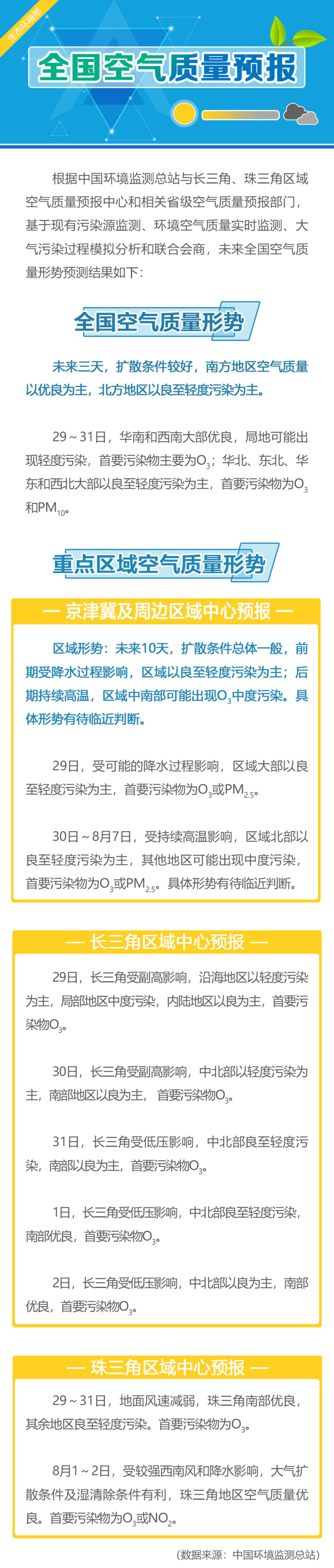 據(jù)生態(tài)環(huán)境部官方微博消息,未來3天(7月29-31日),擴(kuò)散條件較好,南方地區(qū)空氣質(zhì)量以優(yōu)良為主,北方地區(qū)以良至輕度污染為主。