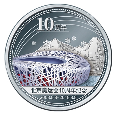 直徑35毫米,由999足銀制作,重15克。采用獨特造幣彩印工藝精細呈現了兩屆奧運會開幕式場館鳥巢的倩影。