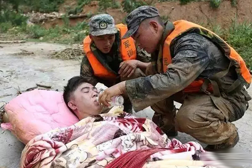 ?。?)2016年,“莫蘭蒂”臺風后,官兵徒步深入災區,在半米深的泥石流和亂石堆中,抬著受傷人員與死神賽跑。一路八小時,戰士們餓著肚子,把僅有的一瓶礦泉水留給了受傷群眾。有中國軍人的地方,就有依靠。