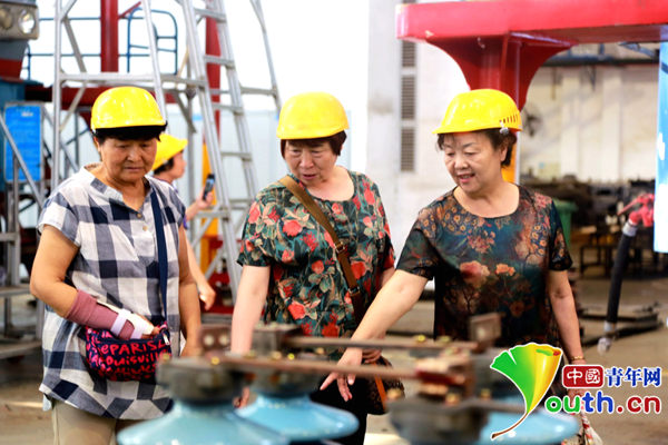 2018年,侯?lèi)?ài)華、胡學(xué)政、白燕娥(從左至右)參觀現(xiàn)代化鐵路車(chē)間。中國(guó)青年網(wǎng)見(jiàn)習(xí)記者 李慧慧 攝