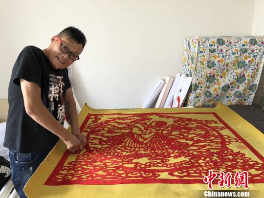 8月15日下午,經過數月的剪制,徐州知名剪布藝人邢浩南終于在七夕節到來之前,創作完成一幅大型剪布作品《牛郎織女圖》。這是繼大型剪布作品《龍門》在2016年獲得英國世界紀錄認證公司認證后,邢浩南自主創作的又一反映中國傳統文化的大幅藝術作品。