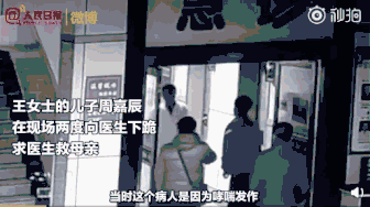 被拽起來后,抹了把眼淚,又跪在了地上,額頭撞地,嘴里不停地哀求醫生救自己的母親。