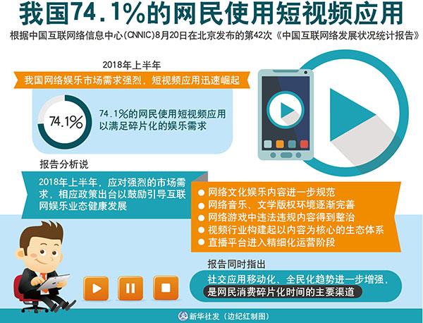 新華社北京8月20日電(記者施雨岑、王思北)根據(jù)中國互聯(lián)網(wǎng)絡(luò)信息中心(CNNIC)20日在京發(fā)布的第42次《中國互聯(lián)網(wǎng)絡(luò)發(fā)展?fàn)顩r統(tǒng)計(jì)報告》,2018年上半年,我國網(wǎng)絡(luò)娛樂市場需求強(qiáng)烈,短視頻應(yīng)用迅速崛起,74.1%的網(wǎng)民使用短視頻應(yīng)用,以滿足碎片化的娛樂需求。