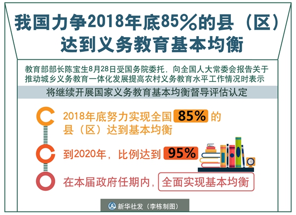 新華社北京8月28日電(記者胡浩)教育部部長陳寶生28日受國務院委托,向全國人大常委會報告關于推動城鄉義務教育一體化發展提高農村義務教育水平工作情況時表示,將繼續開展國家義務教育基本均衡督導評估認定,2018年底努力實現全國85%的縣(區)達到基本均衡,到2020年,比例達到95%;在本屆政府任期內,全面實現基本均衡。