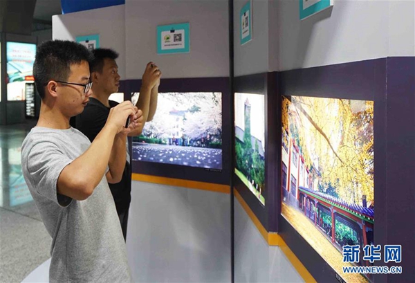 9月1日,在南京南站活動(dòng)現(xiàn)場(chǎng),新生在觀看“南京形象”主題圖片展。 新華社記者季春鵬攝