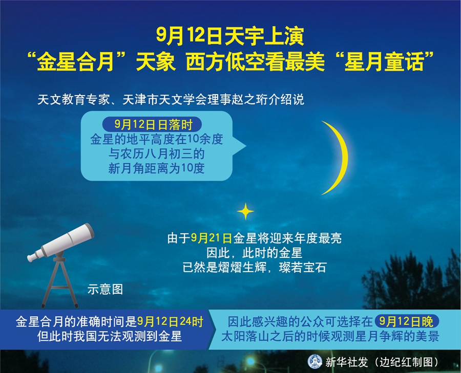 新華社天津9月10日電(記者周潤(rùn)健)天文專(zhuān)家介紹說(shuō),作為行星合月里最美的一幕“星月童話”,“金星合月”12日晚將現(xiàn)身天宇,映美蒼穹。如果天氣晴好,感興趣的公眾抬頭仰望西方低空,憑借肉眼就可欣賞到“維納斯”與“月姑娘”相依相伴的美妙場(chǎng)景。