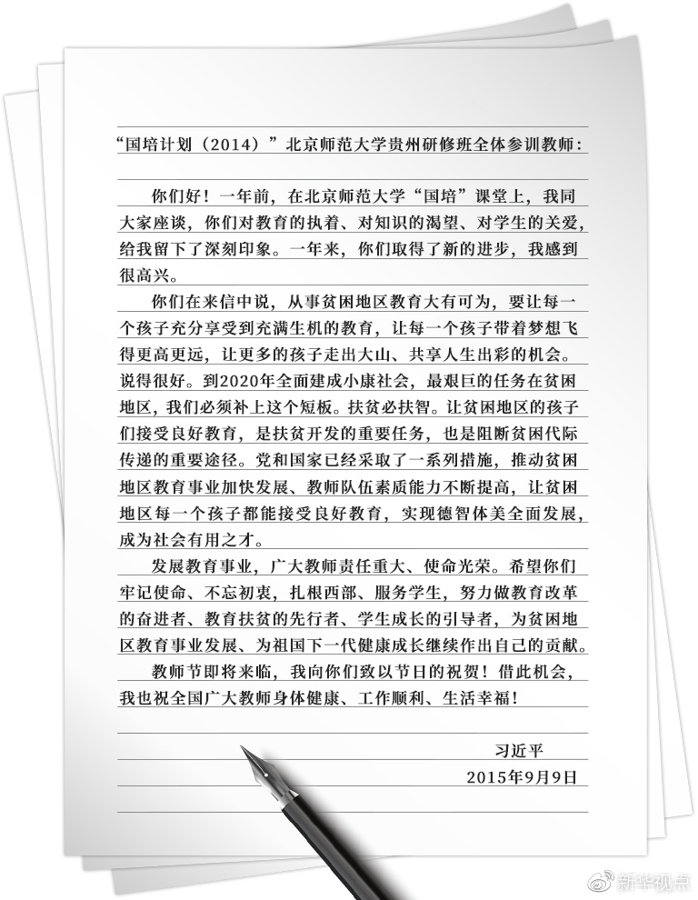 “要讓每一個孩子充分享受到充滿生機的教育,讓每一個孩子帶著夢想飛得更高更遠,讓更多的孩子走出大山、共享人生出彩的機會。”2015年,“國培計劃(2014)”北師大貴州研修班全體參訓教師在給習近平總書記的信中這樣寫道。