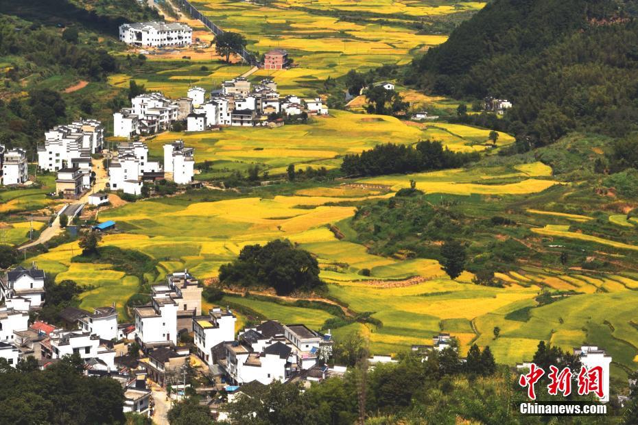 9月13日,在“中國最美鄉(xiāng)村”的江西婺源縣,正值收獲期的金黃水稻與周邊建筑構(gòu)成了一幅美好的田園豐收?qǐng)D卷。中新社發(fā) 曹加祥 攝