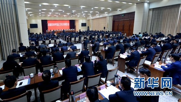 運城市2018年重點工作公開承諾大會會場(4月10日攝)。新華社發
