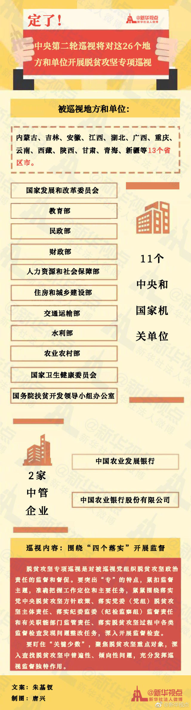 十九屆中央第二輪巡視將對26個地方和單位黨組織開展脫貧攻堅專項巡視-新華網