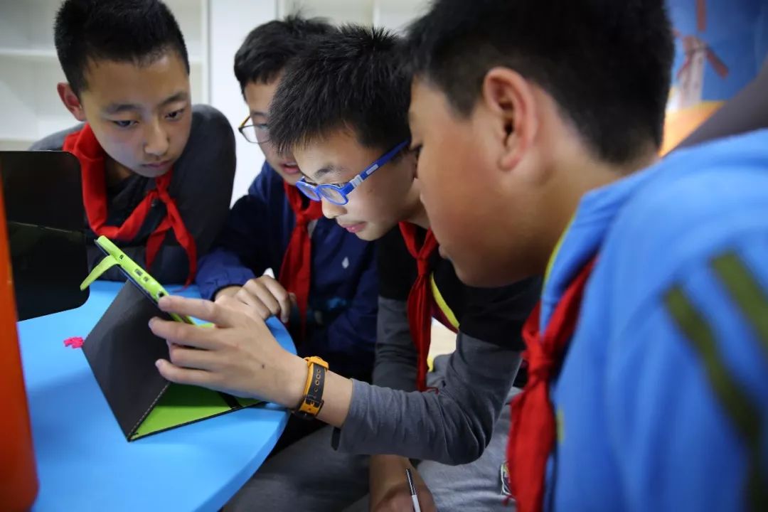 幾位小學(xué)生正在用平板電腦設(shè)計(jì)作品