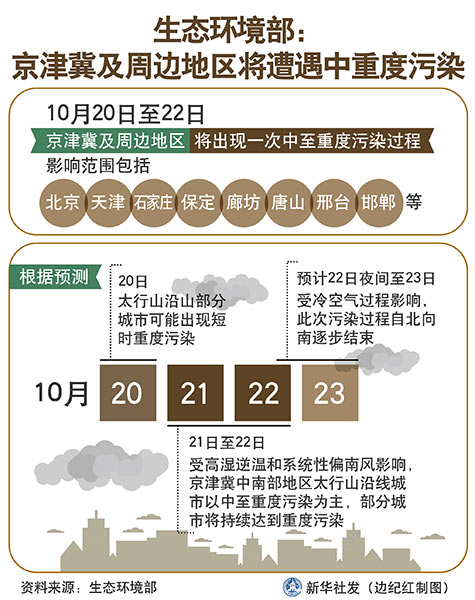 新華社北京10月19日電(記者高敬)記者從生態環境部獲悉,10月20日至22日,京津冀及周邊地區將出現一次中至重度污染過程,影響范圍包括北京、天津、石家莊、保定、廊坊、唐山、邢臺和邯鄲市等。