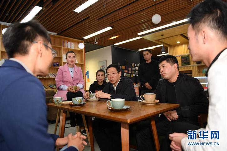 延安市市長(zhǎng)薛占海(中)在延安新區(qū)898創(chuàng)新空間與青年創(chuàng)業(yè)者交流(10月16日攝)。 新華社記者 李一博 攝