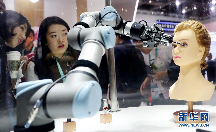 11月7日,參觀者在法國歐萊雅展臺觀看機(jī)器人作業(yè)演示。 休戚與共的地球村,共享創(chuàng)新成果已成為國際社會的共同意愿和現(xiàn)實(shí)選擇。透過進(jìn)博會這個(gè)窗口可以看出,從上下游產(chǎn)業(yè)銜接到前沿領(lǐng)域合作,從協(xié)作共享資源到開放共享智慧,全球經(jīng)濟(jì)發(fā)展的新動(dòng)能正在匯聚。 新華社記者 方喆 攝