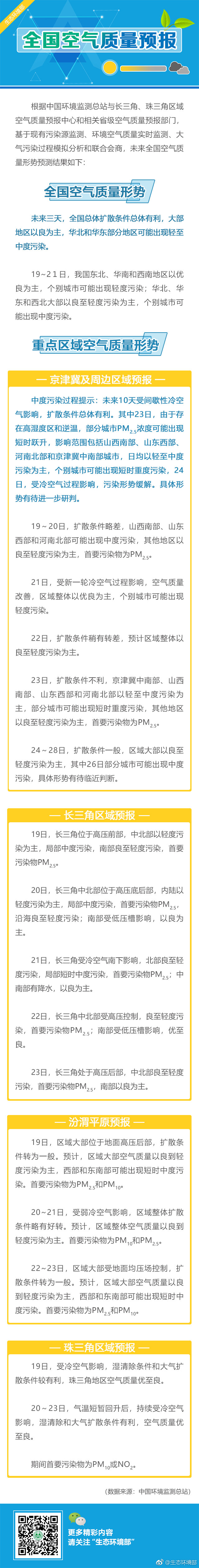 據(jù)生態(tài)環(huán)境部官方微博消息,未來三天(11月19-21日),全國(guó)總體擴(kuò)散條件總體有利,大部地區(qū)以良為主,華北和華東部分地區(qū)可能出現(xiàn)輕至中度污染。