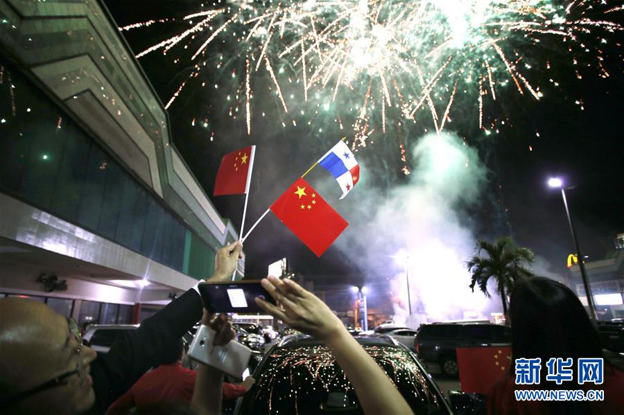 2017年6月12日,在巴拿馬首都巴拿馬城的華人社區,人們在巴拿馬與中國建交的慶祝活動上拍攝煙花。新華社發(毛里西奧·巴倫蘇埃拉 攝)