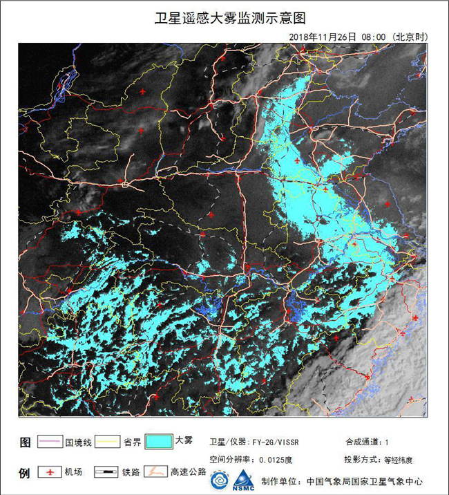 圖為FY-2G氣象衛星大霧監測示意圖像 2018年11月26日08:00(北京時)