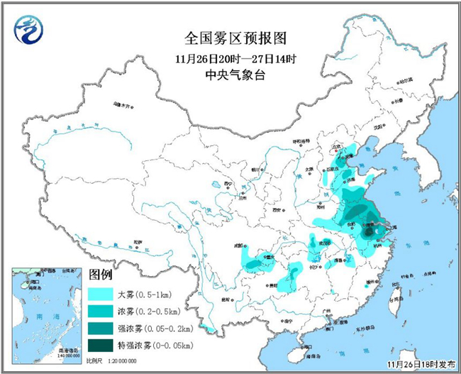 馬學款:根據實況監測數據,11月26日早上,河北中南部、北京東南部、天津、山東中西部、河南中東部、安徽中北部等地出現濃霧或中到重度霾;河北、河南、山東、安徽等地部分地區有能見度不足50米的特強濃霧。26日晚上起,受冷空氣影響,華北平原大霧逐漸減弱或消散。