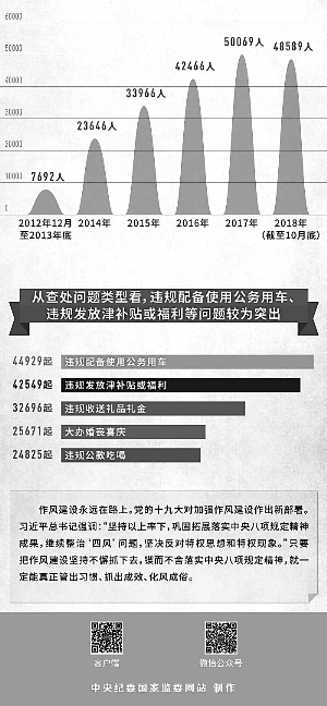 六年來,中央紀委國家監委和各級紀檢監察機關以釘釘子精神打好作風建設持久戰,一個節點一個節點堅守,一個問題一個問題解決,盯緊盯牢、持之以恒,一刻不停歇地推動作風建設向縱深發展,以實際成效將“金色名片”越擦越亮。截至2018年10月底,全國累計查處違反中央八項規定精神問題254808起,處理349552人,給予黨紀政務處分206428人。