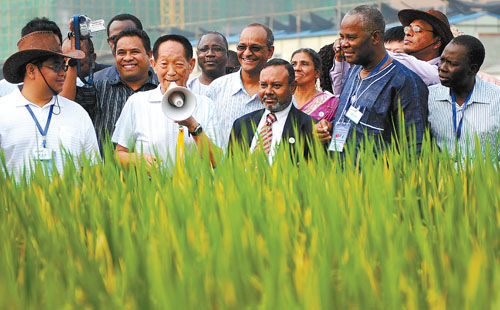 2009年9月,袁隆平帶各國朋友參觀試驗田。新華社發