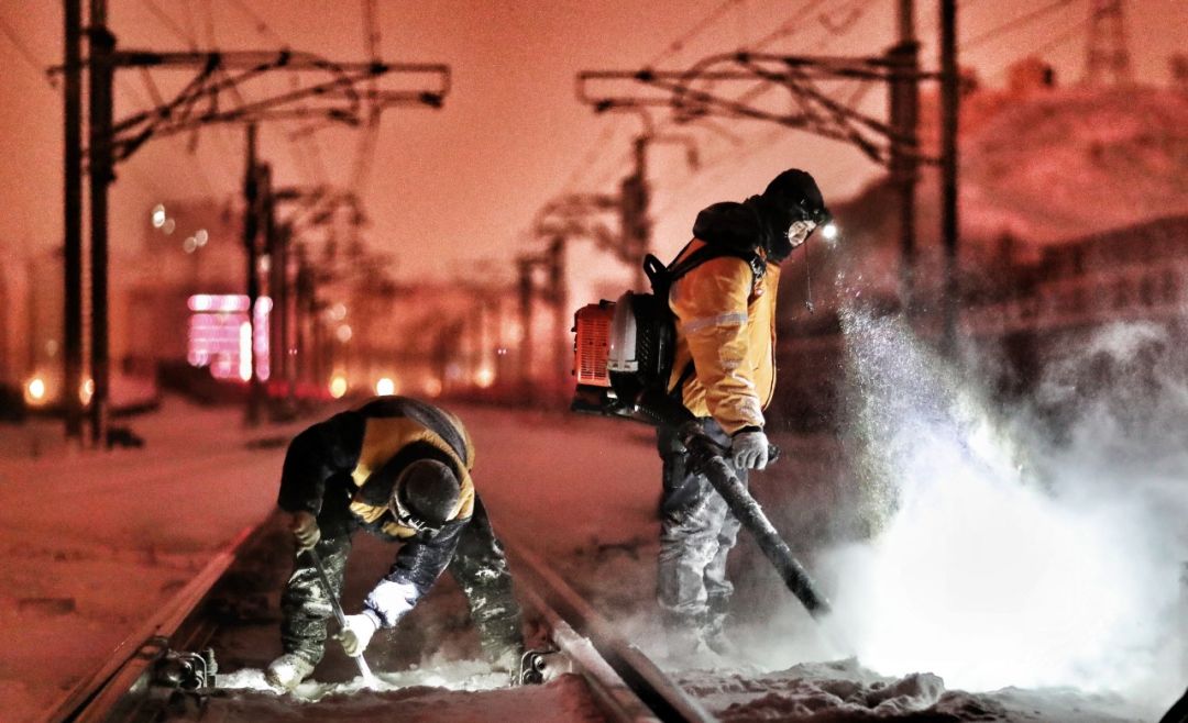 2018-12-05,新疆烏魯木齊站。大雪后,高鐵工務人對高鐵線路的道岔進行除冰清雪作業,保障高鐵安全運行。作者:擺風亮