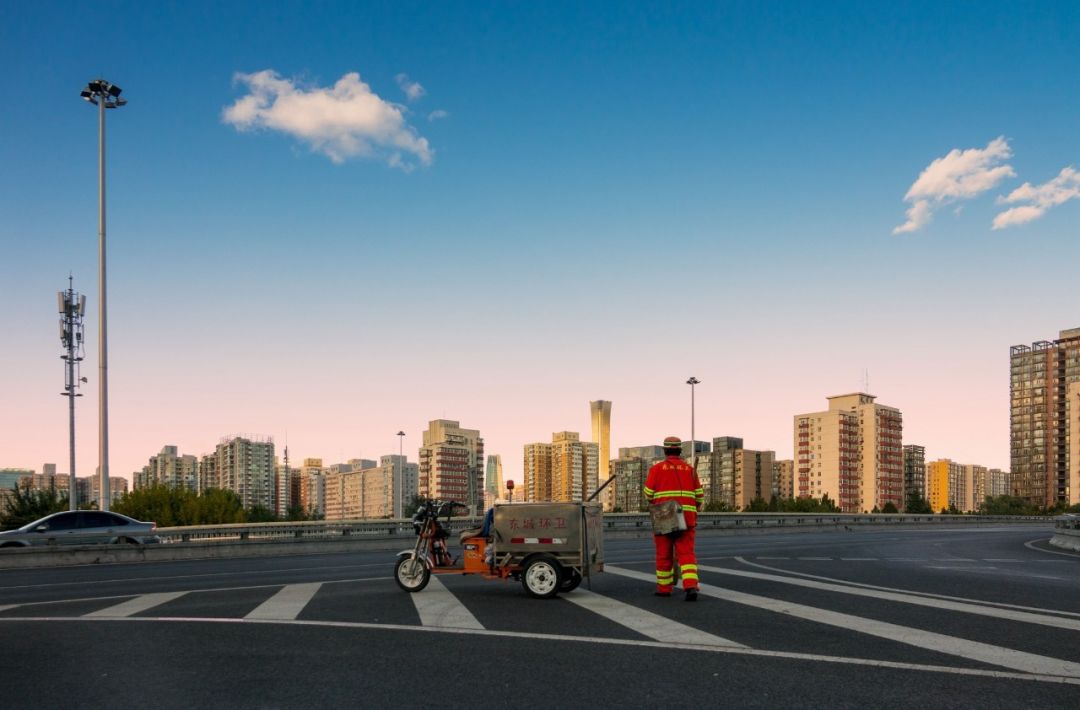 2018-10-09,北京廣渠門橋。你是城市美容師,你梳理著大街小巷,你是城市一景,與藍天相映成輝。作者:月份牌