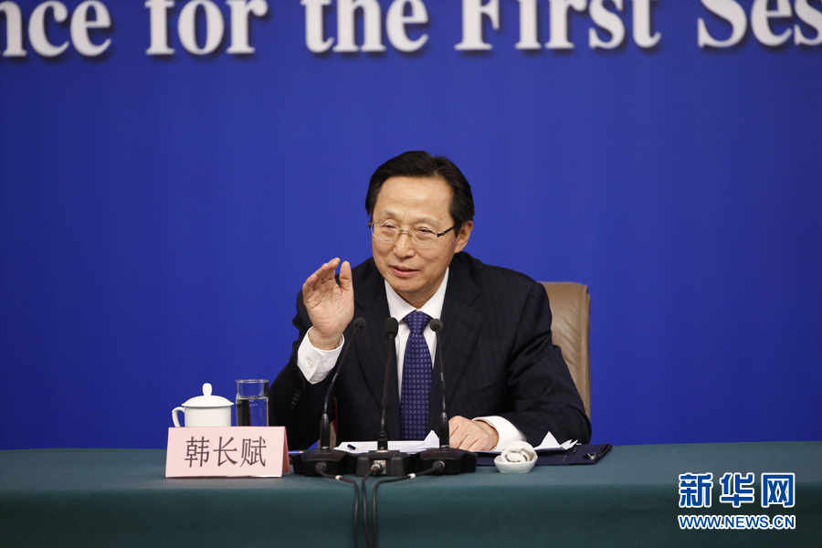 十三屆全國人大一次會議新聞中心于3月7日在梅地亞中心多功能廳舉行記者會,邀請農業部部長韓長賦,農業部新聞發言人、辦公廳主任潘顯政就“實施鄉村振興戰略 推動農業轉型升級”的相關問題回答中外記者的提問。圖為韓長賦回答記者提問。新華網/中國政府網 陳杰 攝