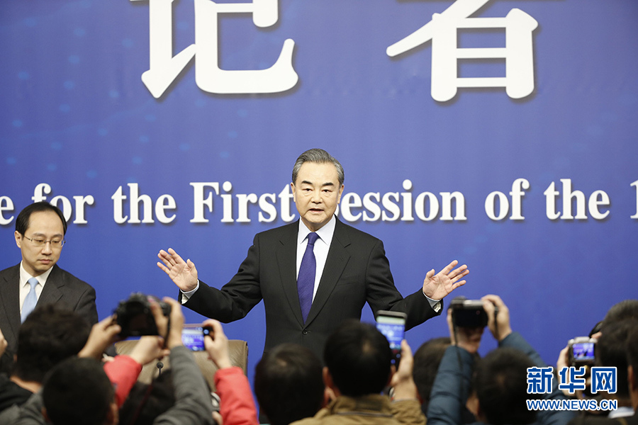十三屆全國人大一次會議新聞中心于3月8日上午10時在梅地亞中心多功能廳舉行記者會,邀請外交部部長王毅就“中國外交政策和對外關系”回答中外記者提問。圖為王毅向記者示意。新華網/中國政府網陳杰 攝
