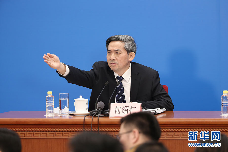 3月11日,十三屆全國人大一次會議新聞中心在人民大會堂一樓新聞發(fā)布廳舉行記者會,邀請十三屆全國人大一次會議秘書處法案組組長、全國人大常委會法工委主任沈春耀,法案組副組長、全國人大常委會法工委副主任鄭淑娜就“憲法修正案”相關(guān)問題回答中外記者提問。圖為記者會主持人何紹仁。新華網(wǎng)/中國政府網(wǎng) 翟子赫 攝