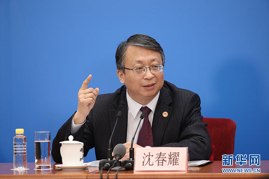 3月11日,十三屆全國人大一次會議新聞中心在人民大會堂一樓新聞發布廳舉行記者會,邀請十三屆全國人大一次會議秘書處法案組組長、全國人大常委會法工委主任沈春耀,法案組副組長、全國人大常委會法工委副主任鄭淑娜就“憲法修正案”相關問題回答中外記者提問。圖為沈春耀回答記者提問。新華網/中國政府網 翟子赫 攝