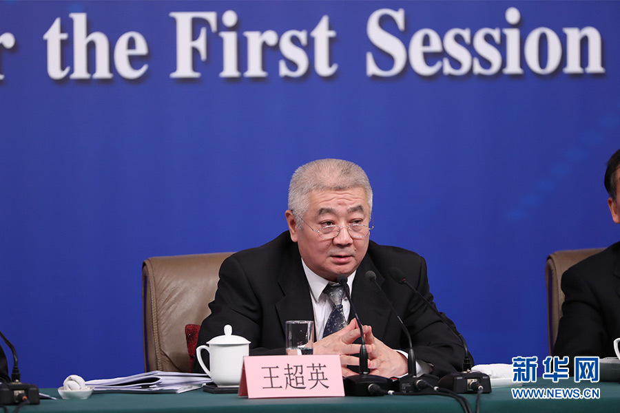 3月12日,十三屆全國人大一次會議新聞中心在梅地亞中心多功能廳舉行記者會,邀請十二屆全國人大內司委副主任委員王勝明、財經委副主任委員烏日圖、教科文衛委副主任委員吳恒、環資委委員呂彩霞,全國人大常委會法工委副主任王超英、副主任許安標就“人大立法工作”相關問題回答中外記者提問。圖為全國人大常委會法工委副主任王超英回答記者提問。新華網/中國政府網 翟子赫 攝