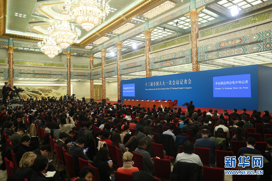 3月20日上午,十三屆全國人大一次會議閉幕后,國務院總理李克強在人民大會堂三樓金色大廳會見采訪十三屆全國人大一次會議的中外記者并回答記者提出的問題。圖為記者會現(xiàn)場。 新華網(wǎng)/中國政府網(wǎng) 翟子赫 攝