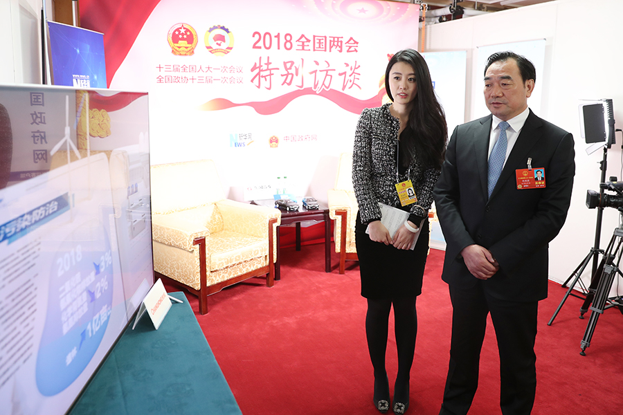 3月20日,全國(guó)人大代表、江蘇省徐州市市長(zhǎng)周鐵根在新華網(wǎng)人民大會(huì)堂兩會(huì)特別訪談間內(nèi)觀看新華網(wǎng)創(chuàng)意視頻產(chǎn)品《躍然紙上看報(bào)告》。新華網(wǎng) 郝廣鵬 攝
