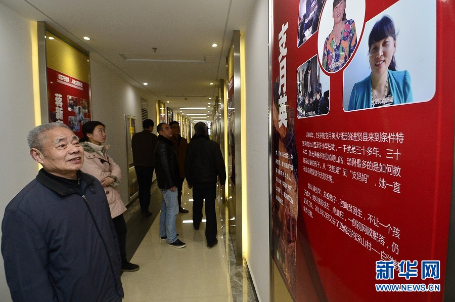 市民在江西省南昌市東湖區(qū)圖書館參觀“德耀贛鄱”大型圖片巡展(2017年3月7日攝)。此次圖片展共收集、整理18位道德模范與“身邊好人”的先進(jìn)事跡材料。新華社記者 彭昭之 攝