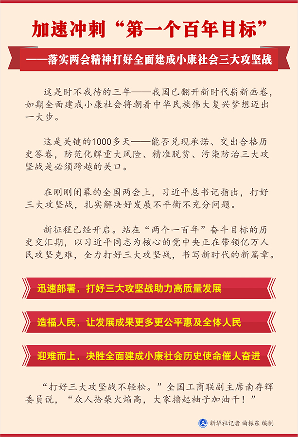 新華社北京3月29日電? 題:加速沖刺“第一個百年目標”——落實兩會精神打好全面建成小康社會三大攻堅戰