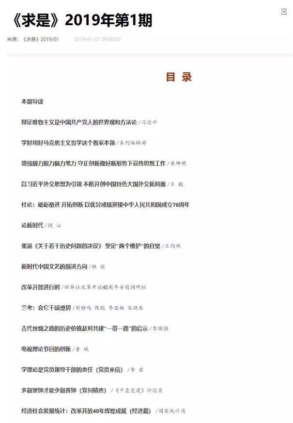 中共中央機關刊《求是》雜志從2019年1月1日出版的第1期起全新改版。這是黨中央進一步加強全黨思想理論建設,堅持用習近平新時代中國特色社會主義思想武裝全黨、教育人民、指導實踐的重大舉措,體現了以習近平同志為核心的黨中央,對發揮好黨中央主辦的理論刊物指導全黨全國工作重要思想理論陣地作用的高度重視。