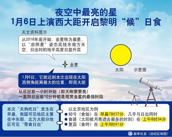 新華社天津1月4日電(記者周潤健)對于天文愛好者來說,本月6日注定會是一個忙碌的早晨,看完西大距的金星,就可以繼續欣賞一次精彩的日偏食。