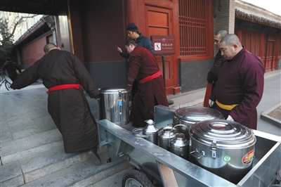 雍和宮內僧人們搬運連夜熬制的臘八粥。